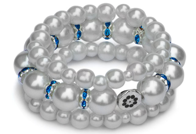 Korussa on klassisia valkoisia helmiäislasihelmiä ja sinisiä strasseja.