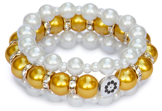 Korussa on kullankeltaisia ja valkoisia helmiäislasihelmiä sekä kullan/hopeanvärisiä strasseja.