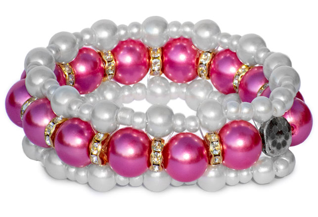 Korussa on pinkkejä ja valkoisia helmiäislasihelmiä sekä kullan/hopeanvärisiä strasseja.