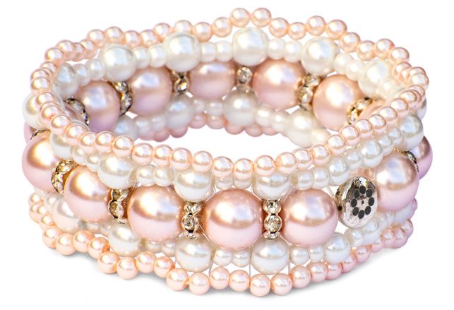 Korussa on hennon vaaleanpunaisia ja valkoisia helmiäislasihelmiä sekä hopeanvärisiä strasseja.