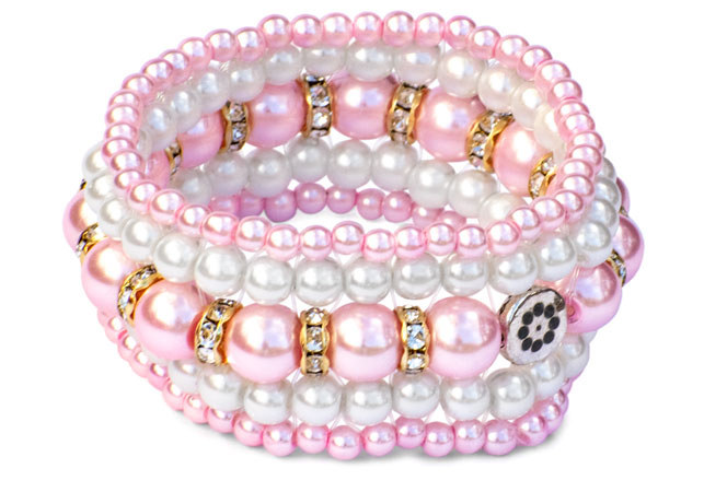 Korussa on vaaleanpunaisia ja valkoisia helmiäislasihelmiä sekä kullan/hopeanvärisiä strasseja.