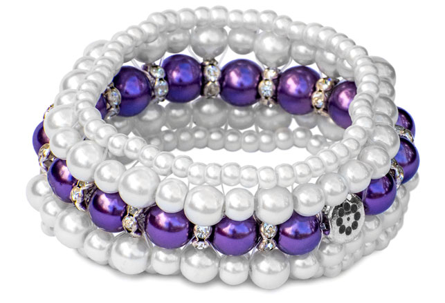 Korussa on violetteja ja valkoisia helmiäislasihelmiä sekä hopeanvärisiä strasseja.