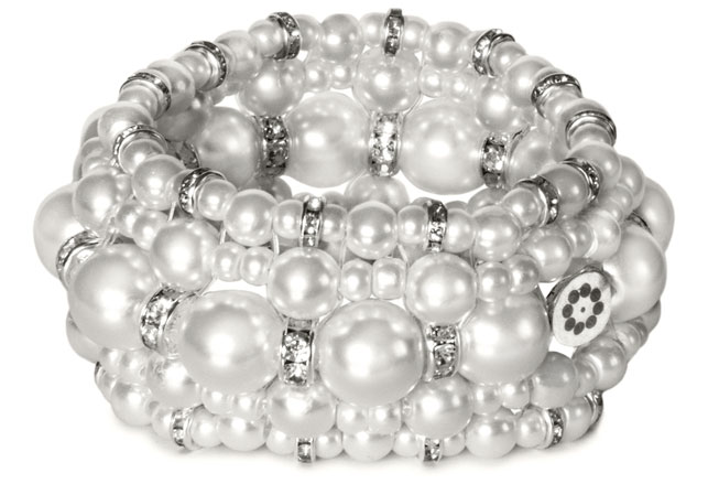 Korussa on klassisia valkoisia helmiäislasihelmiä ja hopeanvärisiä strasseja.