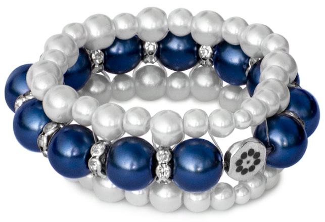 Korussa on tummansinisiä ja valkoisia helmiäislasihelmiä sekä hopeanvärisiä strasseja.