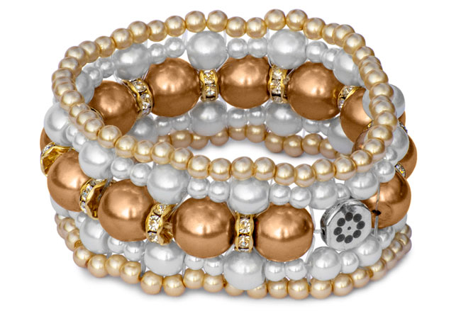Korussa on ruskeita, valkoisia ja beessejä helmiäislasihelmiä ja kullan/hopeanvärisiä strasseja.