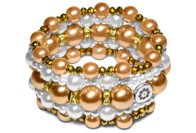 Korussa on ruskeita ja valkoisia helmiäislasihelmiä, kullanvärisiä kiiltäviä helmiä ja kullan/hopeanvärisiä strasseja.