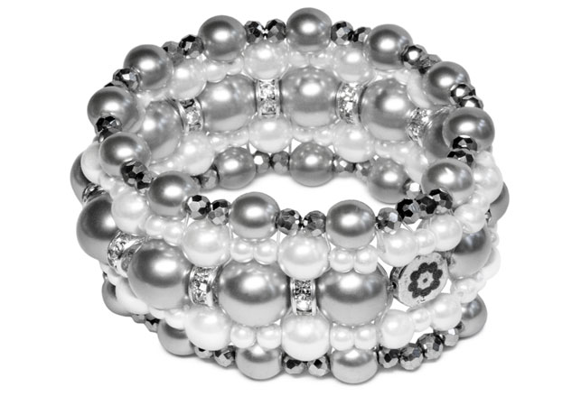 Korussa on valkoisia ja harmaita helmiäislasihelmiä, hopeanvärisiä kiiltäviä helmiä ja hopeanvärisiä strasseja.