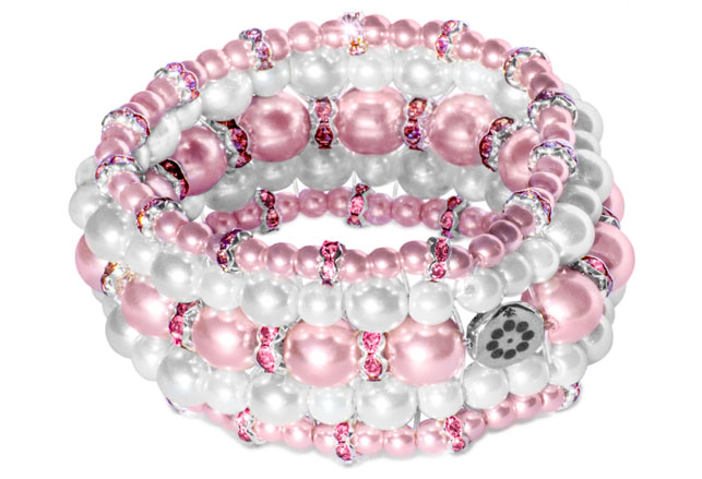 Korussa on valkoisia ja vaaleanpunaisia helmiäislasihelmiä sekä pinkkejä strasseja.