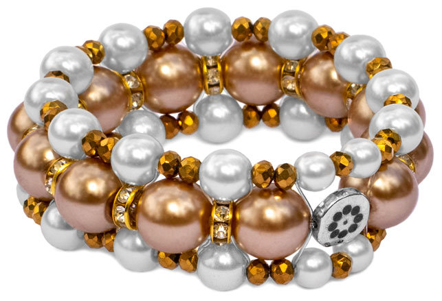 Korussa on ruskeita ja valkoisia helmiäislasihelmiä, kullanvärisiä kiiltäviä helmiä sekä kullan/hopeanvärisiä strasseja.