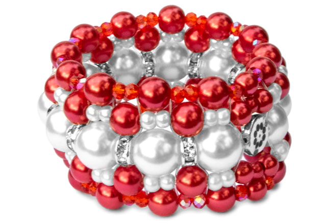 Korussa on valkoisia ja punaisia helmiäislasihelmiä, punaisia kiiltäviä helmiä sekä hopeanvärisiä strasseja.
