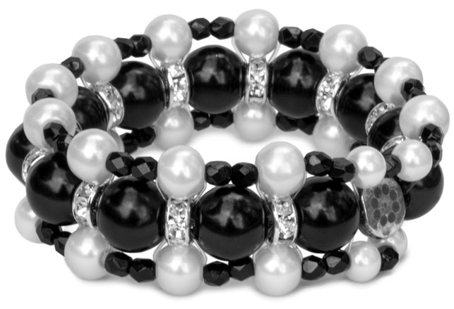Korussa on mustia ja valkoisia helmiäislasihelmiä, mustia kiiltäviä helmiä ja hopeanvärisiä strasseja.