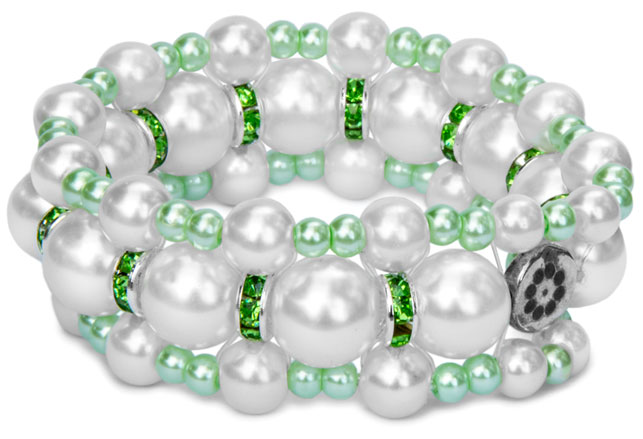 Korussa on valkoisia ja vaaleanvihreitä helmiäislasihelmiä sekä vihreän/hopeanvärisiä strasseja.