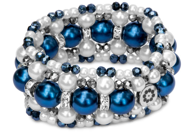 Korussa on tummansinisiä ja valkoisia helmiäislasihelmiä, tummansinisiä ja hopeanvärisiä kiiltäviä helmiä ja hopeanvärisiä strasseja.