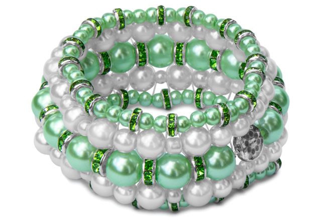 Korussa on valkoisia ja vaaleanvihreitä helmiäislasihelmiä sekä vihreän/hopeanvärisiä strasseja.