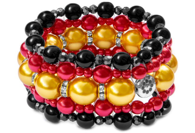 Korussa on keltaisia, punaisia ja mustia helmiäislasihelmiä, mustia kiiltäviä helmiä sekä kullan/hopeanvärisiä strasseja.