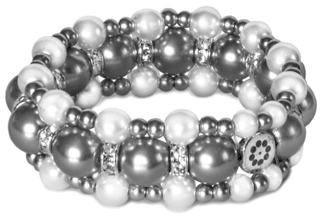 Korussa on harmaita ja valkoisia helmiäislasihelmiä sekä hopeanvärisiä strasseja.