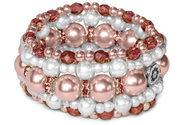 This piece of jewellery features light pink and white pearl glass beads with rose shiny beads and silver plated pink strass rondelles.