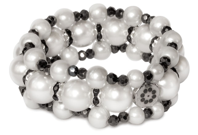 Korussa on valkoisia helmiäislasihelmiä, mustia kiiltäviä helmiä ja mustia strasseja.