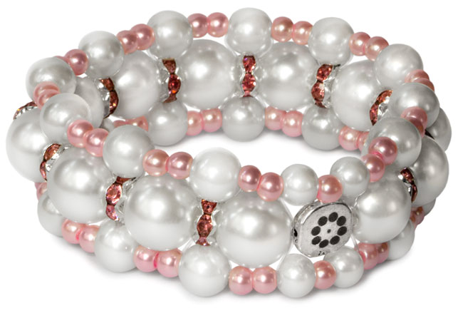 Korussa on vaaleanpunaisia ja valkoisia helmiäislasihelmiä ja pinkkejä strasseja.