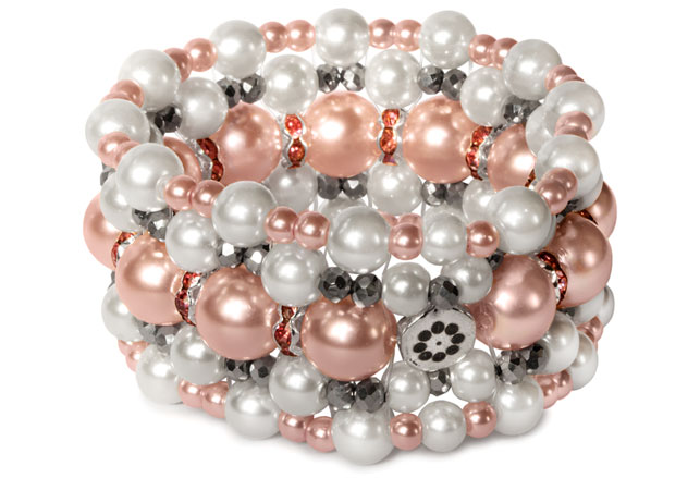 Korussa on valkoisia ja vaaleanpunaisia helmiäislasihelmiä, hopeanvärisiä kiiltäviä helmiä sekä pinkkejä strasseja.