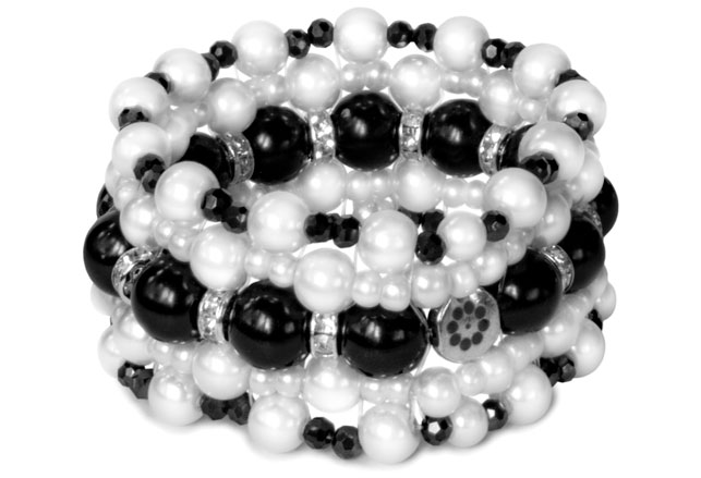Korussa on mustia ja valkoisia helmiäislasihelmiä, mustia kiiltäviä helmiä sekä hopeanvärisiä strasseja.